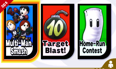 The next one I wanna talk about is the Multi-man Smash, Target Blast and Home-run Contest. The only thing I think I have complaints about is the Target Blast. I think I like its predecessors better. i like the "Break the Targets" to see how fast I can get all of the targets while using different characters and they all have their own specific stages set up for them for you to be able to utilize their move sets in the most quick and efficient way so that you can get the fastest clear time. I liked the older one best since for me it required you to think up of ways to get things done fast and it will make you think up of new ways to beat your fastest time. The Target Blast is almost like the Home-run contest now. Beat up the bomb the get the best results. Its just like "beat up the sand bag to make him fly the farthest." type of thing. I think it just took off the variety it used to have when it had a mechanic all on its own. The new Multi-man Smash now takes the form of of the Mii which makes so much sense and is now more nice to look at that the wire frame like silhouettes like before and if I remember right Brawl had the primids. (Do correct me if I'm wrong on the primids.) The home-run Contest for me is pretty much still the same. I was never good at it but I was still fun for me.